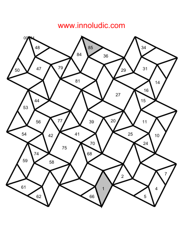 In the form presented here, the cellsare either square, triangular, or diamond-shaped. You will also notice that they are not all the same size. So, starting from square 1 and ending at the last square on the path: 85, try to find this path. You can move from one cell to another if one corner of a cell touches another. Think outside the box and have fun.