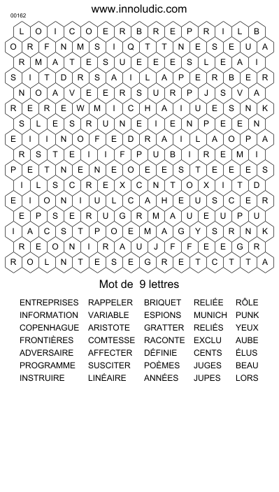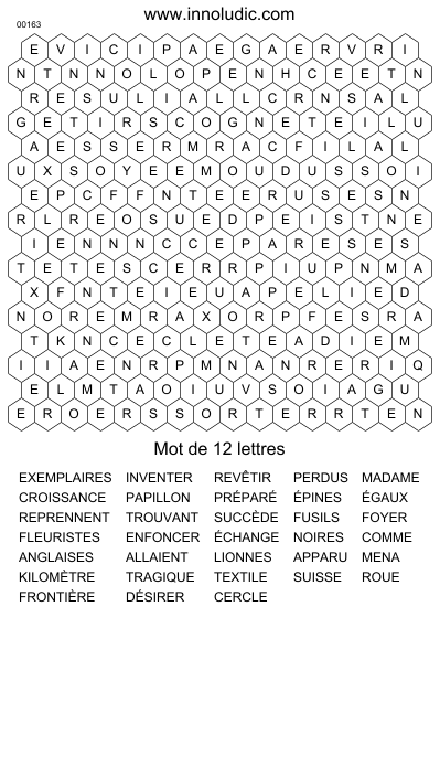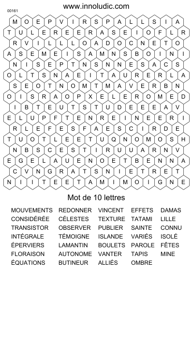 Voici un des jeux le plus appréciés sur ce site : les Mots Abeille. Ceux qui les résolvent savent pourquoi. Pour les autres qui n’ont pas eu la chance de connaitre ce jeu, alors voici, dans une grille composée d’alvéoles, il faut trouver tous les mots de la liste. Les lettres restant forment le fameux mot à trouver. Cela est semblable au mot caché, sauf que les mots dans la grille suivent des sinuosités au lieu d’aller en ligne droite. La forme des cases de la grille, qui sont hexagonales, ajoute un défi supplémentaire. Mais le mieux est de résoudre ces jeux pour vous faire une idée par vous-même. Voici trois grilles.