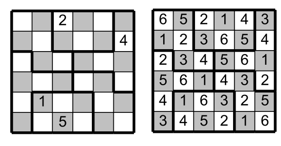 Le sudoku échiquier (je vais utiliser ce nom à défaut d’en trouver un meilleur) est un croisement entre le sudoku chaos et le sudoku pair. Il se compose de case grise et blanche et possède des régions de tailles irrégulières. La grille usuelle est de taille 10X10, mais elle peut avoir d’autres tailles qui cependant, doivent être paires (8x8,12x12). Il faut, comme dans tout sudoku, que chaque colonne, rangée et région contiennent tous les nombres de 1 à 10 (dans le cas d’une grille 10x10). Mais en plus chaque case blanche doit avoir un nombre pair (2,4,6,8,et 10) et les cases grises des nombres impairs (1,3,5,7 et 9). Voici une grille de 6x6 avec la solution.