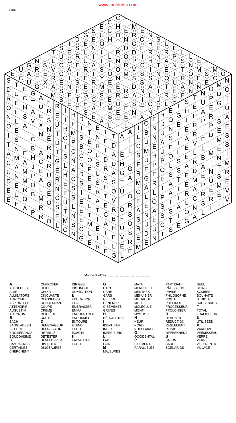 Il contient 50 grilles géantes avec près de 85 mots par grille. Les mots au lieu d’être placés dans une grille conventionnelle, sont plutôt placés dans une grille en forme de cube. Les mots peuvent commencer sur une face et continuer sur une autre face, voire même sur les deux autres faces du cube. Il va sans dire que les mots peuvent s’écrire dans tous les sens et se croiser dans la grille. À la fin, quand tous les mots sont trouvés, les lettres restantes forment le mot mystère. L’aspect le plus surprenant est que vous serez vite dérouté quand un mot parcourra plusieurs faces. Vous aurez l’Impression que la direction change, mais non ,c’est seulement à cause que vous changez de plan. Par exemple, si un mot s’écrit en diagonale sur une face, il continuera à être en diagonale, mais, comme les cases de l’autre face du cube sont sur un plan géométrique différent de la première face, alors vous continuerez à l’écrire en diagonale dans cette face. Bon, le mieux, c’est de l’essayer. Voici une grille géante.