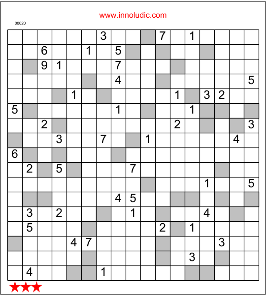 Here’s a 17x17 Super Yakazu puzzle for Yakazu fans. This mega-grid is designed to satisfy the appetites of the puzzle’s many admirers. There are several entries, but none is larger than nine squares, so you’ll need to use the numbers 1 through 9. If you’re looking for a bit of a challenge, this is it. In any case, it doesn’t require complicated solving techniques—it just takes a little longer to complete. I’m thinking of publishing a book featuring puzzles of this size.