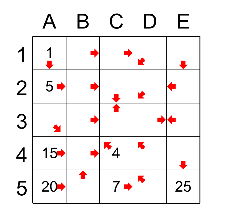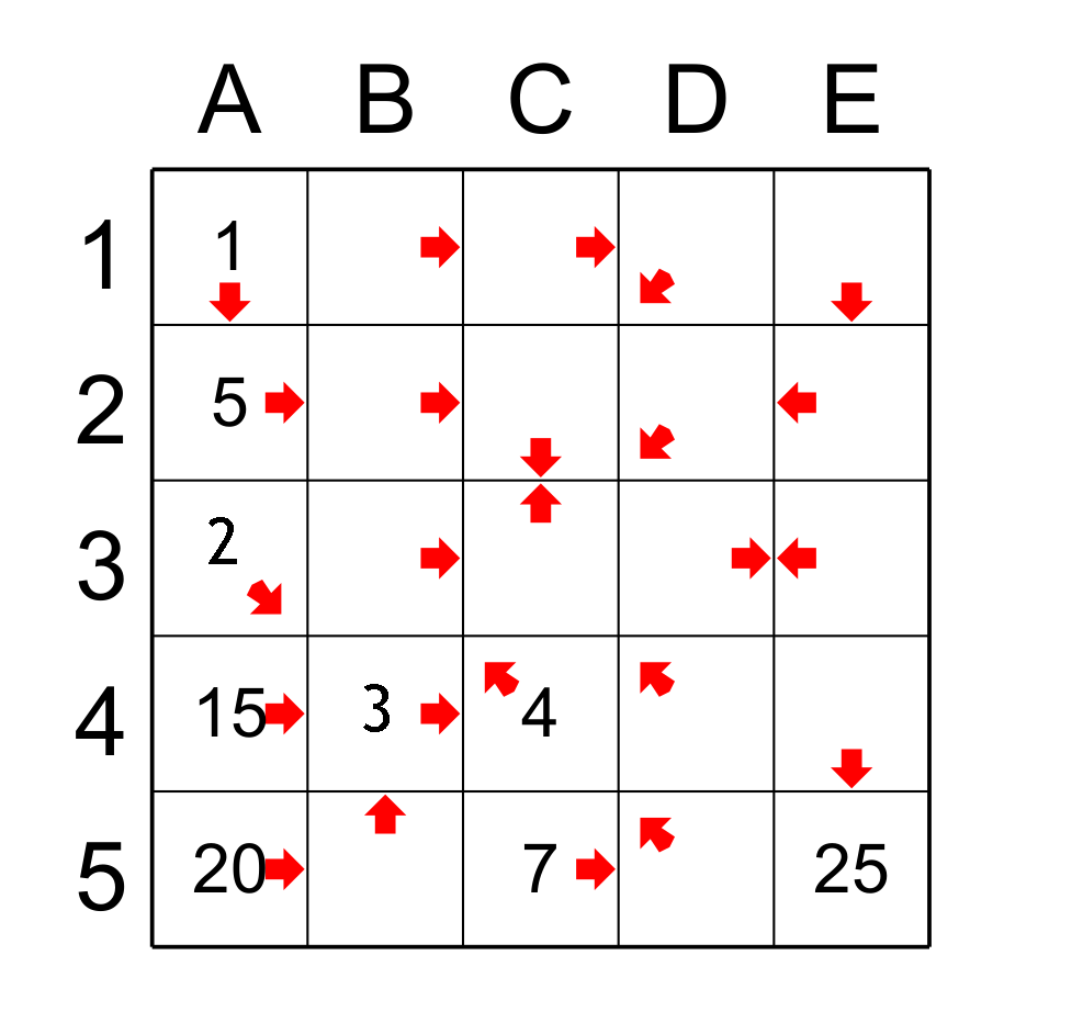 We can still find cells with these principles: the cell E4 points only to E5 so it has the value 24. And as E4 is only pointed by the cell E1, then E1 is the predecessor with 23. We have reached the limits of these two principles and we must apply other reasoning. Figure 5.