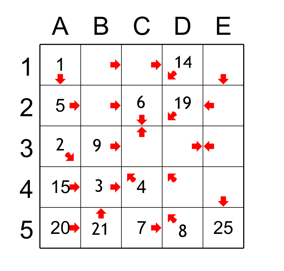 In order to progress, we have to find the gaps. We have found the sequence from 1 to 9, from 14 to 16, from 19 to 21 and from 23 to 25. Now we have to find the gaps. It is often easier to deal with the smaller gaps between two sequences. So the gap between 21 (B5) and 23 (E1) is 1 because only one cell ( 22 ) is missing. So it is necessary to find a cell which will be the successor of the cell B5 and which will be at the same time the predecessor of the cell E1. Only the cell B1 fulfills this role so B1 gets the value 22.