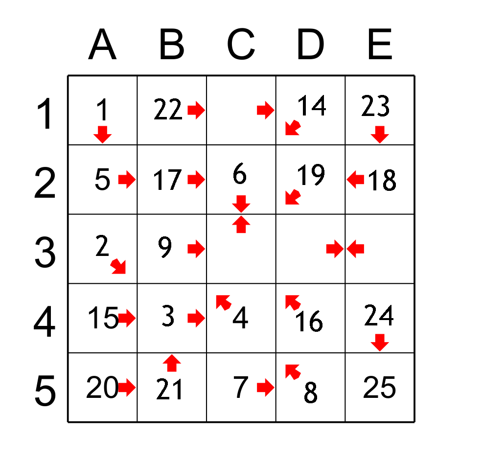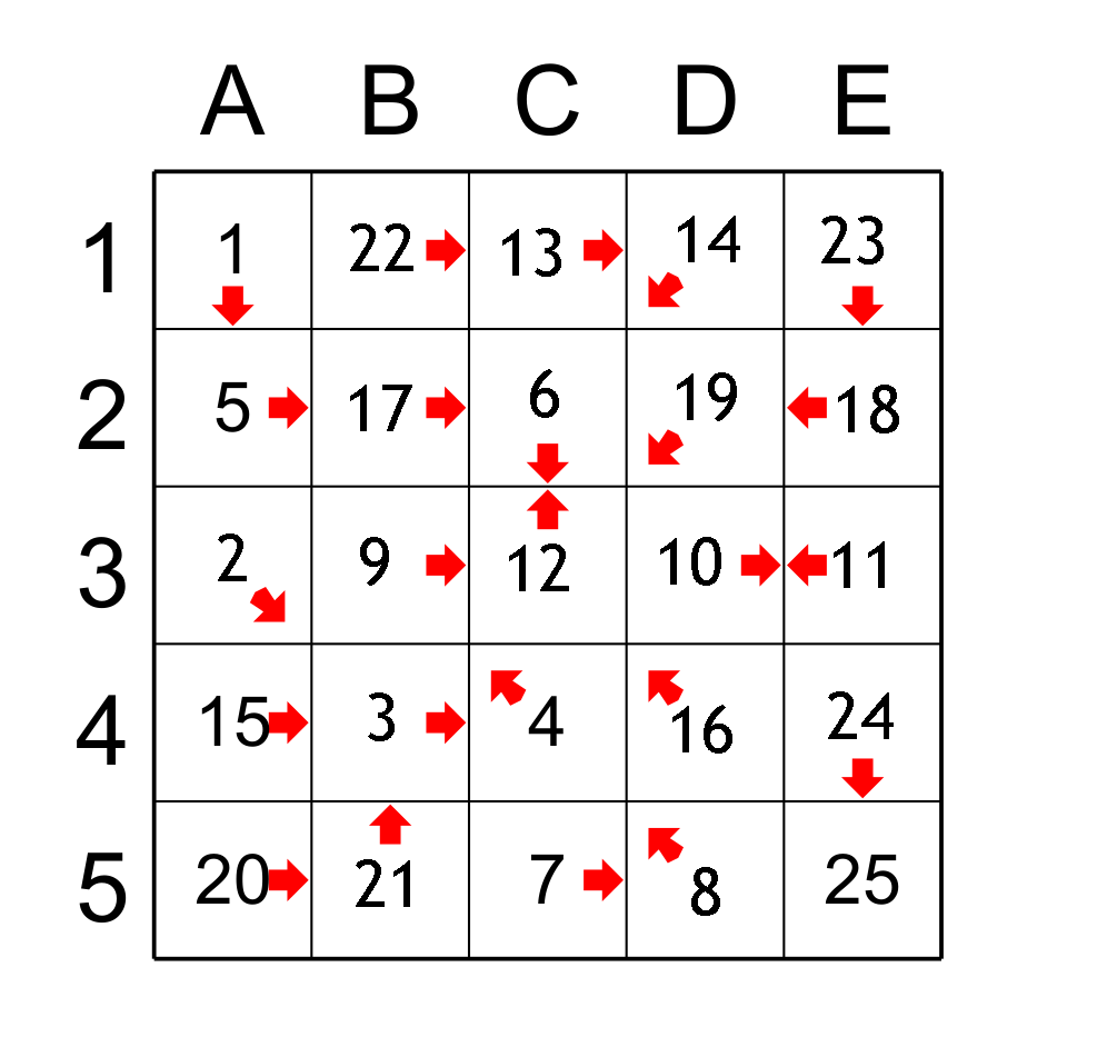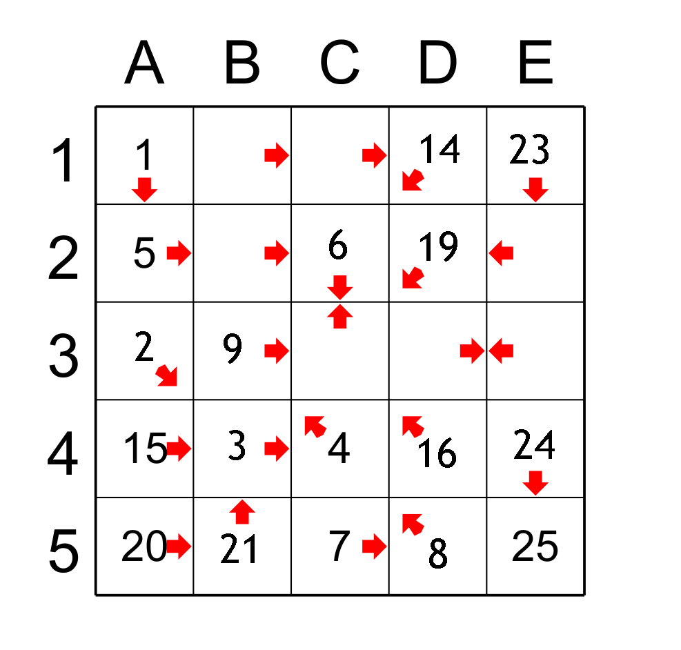 For ease of explanation, I identify columns by letters and rows by numbers. So box A1 is at the intersection of column A and row 1. In order to clarify my explanations I will use the terms successor and predecessor, for example the predecessor of a cell before the number 10 is the cell that has the number 9 and the successor of cell 10 is the cell that has 11.