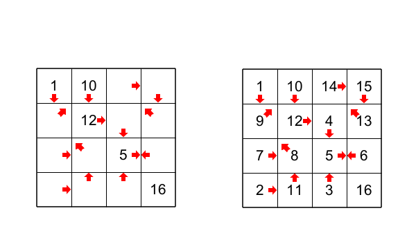 The goal is simple, you just have to reconstruct a path that goes through all the squares of a grid from the cell with the number 1 to the last cell (the cell wihtout arrow). The arrow in a cell indicates the direction of the next cell in the path. There are some cells that already have numbers, so you have to find the path.
