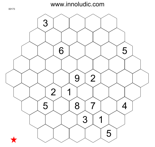 You have to enter a series of consecutive numbers (between 1 and 9) in each row and diagonal, depending on the length of the row or one of the diagonals. Thus, the center row containing 9 hexagons will have the numbers 1 to 9. For a row consisting of six hexagons, the possible combinations would be 1,2,3,4,5,6, 2,3,4,5,6,7, up to 4,5,6,7,8,9. This rule also applies to diagonals, so a hexagon that is at the intersection of a row and two diagonals must respect the shortest length.