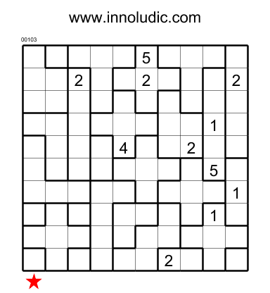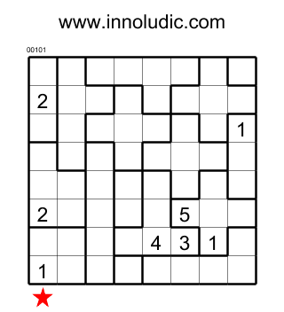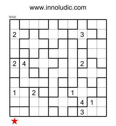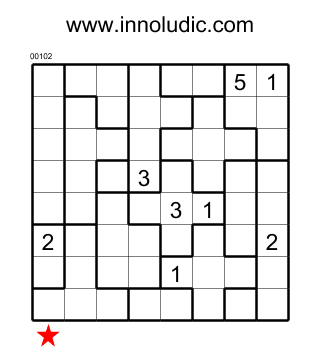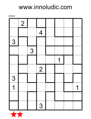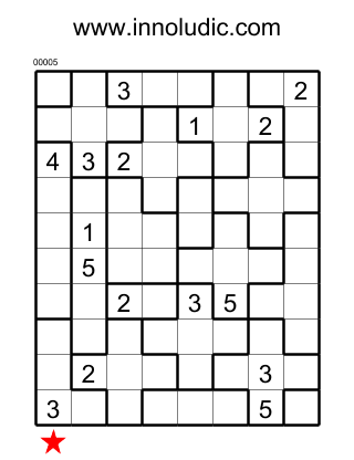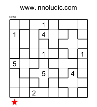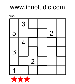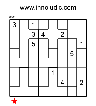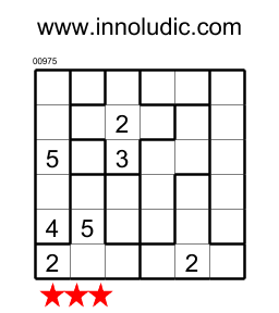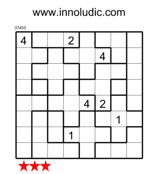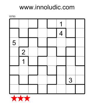 Similar to Suguru with only a slight difference in the rules we can say that the Ripple Effect puzzles (Rules of Ripple Effect) is a different game. The difference is : in Suguru if a cell has a number then all the cells touching this initial cell cannot have this number while if a cell in a Ripple Effect has a number then the number of cells not touching the initial cell depends on the value of the number in the initial cell. For example, if a cell contains the number 3 then the 3 cells at the right, left up and down the initial cell cannot have the number 3 (in fact the initial cell is in the middle of a cross) . Notice that contrary to Suguru the Ripple Effect ignore the diagonals so you just have to take into account the four directions around the cell (north,east,south and west). The other rule is common to the two puzzles: each region of size N must contain all the number from 1 to N.