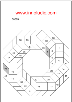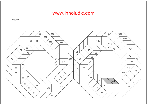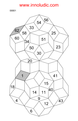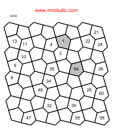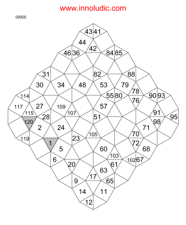 Your goal is to find a path starting with the first cell up to the last cell (grayed cells) by visiting each cell. Some cells (with the numbers) indicate the order of the cell in the path. Please remind that the path goes from one cell to any cells that touch one of the corner of the initial cell and so on up to last cell. A triangular cell can reach 9 cells and a square cell can reach 12 cells.