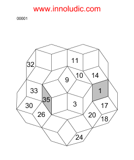 I continu to explore with the Hidoku puzzle. Now I try a penrose grid with as a cells: diamonds with the pecularites of the penrose tiling. So I present you first a puzzle with a simple grid and secondly a puzzle with a double grid. Do no forget from a cell you can acces any cells that corner touch one of the corner of the inital cell. In each puzzle the first and last cell are grayed. (Hidoku's Rules).