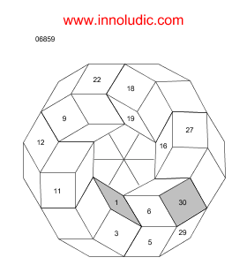 I said in a previous article that the Hidoku puzzle is very flexible ( Hidoku # 3). I told you also that the form of the cells could affect how we move from onr cell to another. This week I propose you a grid with diamonds of different shape. As I told you the best way to find which cells you could go from one cell (the initial cell) is to look which cells the corners of the initial cell touch. When a cell is a square or a pentagon we know the principle. But when a cell is a diamond then a corner of cell with a sharp angle could touch many more cells ( the maximum of cells a corner of a square cell can touch is 3 other cells). So I propose you a grid with a shape of a donut made of many diamonds ( I have found this interesting geometric form on the web, I have tought that it could form an interesting grid for a Hidoku) . For this grid you start form the number one up to 30 (the grey cells). When we have only one donut the maximun cells that the corner of a cell could touch is 3. (Notice that in the middle- the hexagon- you could could travel from one cell to the opposite cell, it adds more possibility). For the second puzzle I have gathered three donuts together, then when two donut are adjacent then the maximum number of cell that a corner of one cell could touch is 5 (look at the cell number 1, the left corner). For the last puzzle you have to find a path from 1 to 90. (Hidoku's Rules).