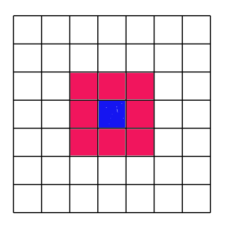 we are able to reach any of the six red cells. Notice that with hexagonal cells we are able to reach at most 6 cells instead of 8 for the square cells. All this is related to the specic geometry of the cells. A corner of a square is able to touch three cells and a corner of an hexagonal cell is able to touch two cells only.