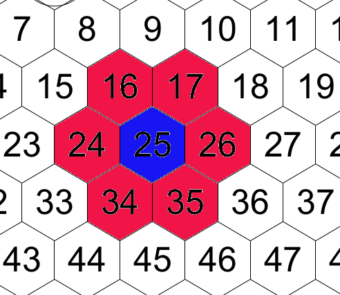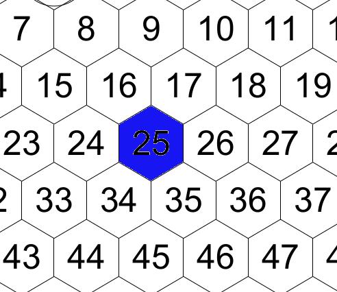 But we can generalize that we could move from one cell (the starting cell) to any other cells that touch one corner of the starting cell. And we can apply this rule to any shape of cell (instead of saying to move horizontaly, verticaly, etc). Like for the octogonal cell. The following figure illustrates a portion of a grid with hexagonal cells. From the blue cell, with this rule (going to cell that touch a corner of the starting cell),