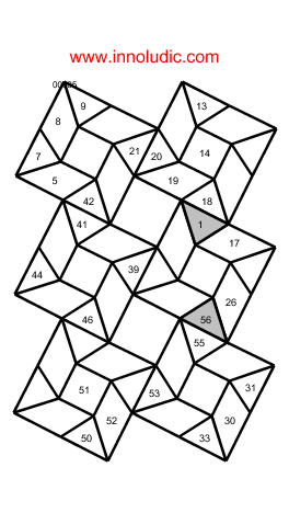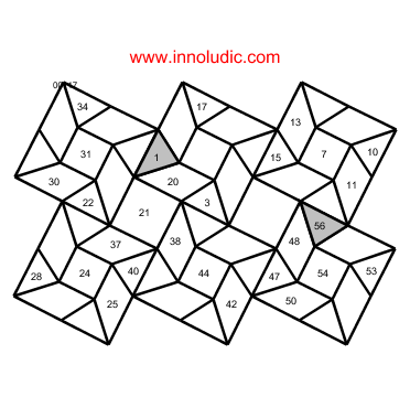 Here are some Hidoku games whose cells are either diamonds or triangles. The aim is to trace a path through all the cells. You have to trace the path from the first cell having number 1 to the last cell with the number 56, passing from one cell to the next immediately adjacent (one cell which touches the previous cell). Some of the cells on the path are revealed; they contain numbers. You have to fill in all the empty cells with the missing numbers. Go ahead... you'll enjoy it.