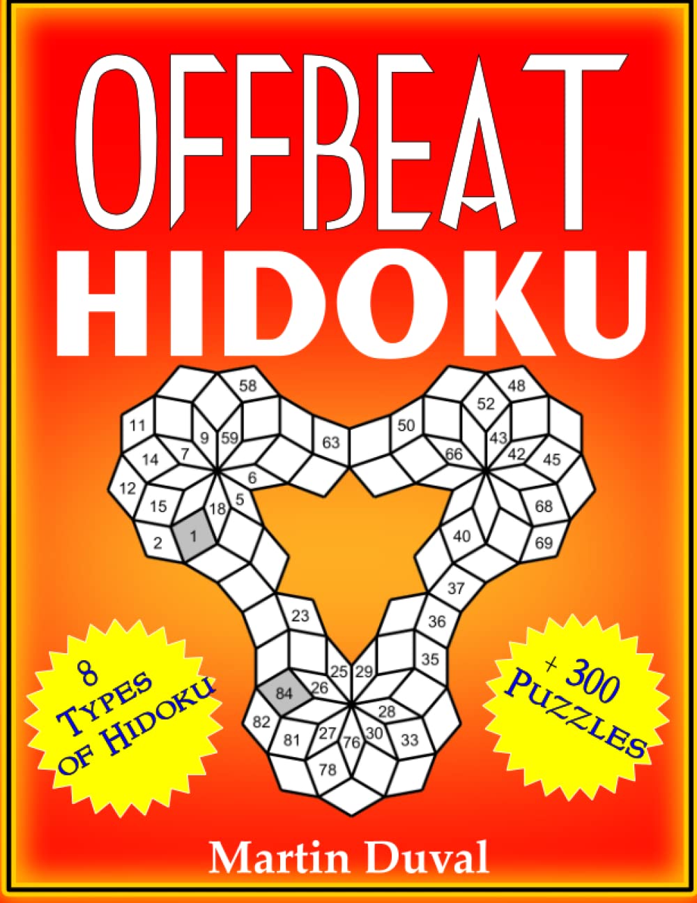 This book is the result of two years of experimentation with hidokus. I've tried to revisit the Hidoku by modifying both the shape of the grids and the shape of the squares within them. If you are used to Innoludic you have seen some of my grids : Octogonal, Penrose, Cairo Tiling, ... etc. So Offbeat Hidoku contains 8 different kinds of grid and each kind has various shape with a total of more than 300 puzzles. This book is good complement of Hidoku Galore (Hidoku # 10: Hidoku Galore), these two books where published the same day.