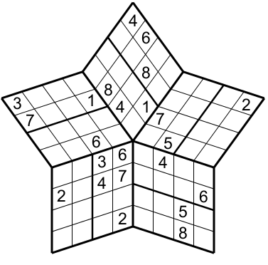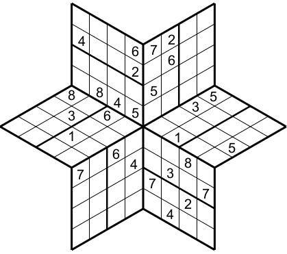 Il y a belle lurette que je ne vous avais pas présenté des Spark Sudoku. En voici 3 qui sont des étoiles à 6 branches. Chacune des branches est composée de 2 régions rectangulaires de 2x4, les rangées et colonnes commencent sur une branche et se terminent sur la branche suivante. Il faut donc entrer les nombres 1 à 8.