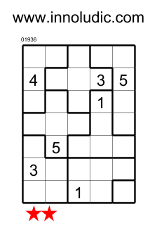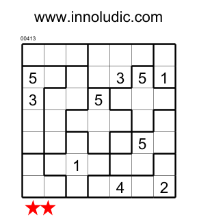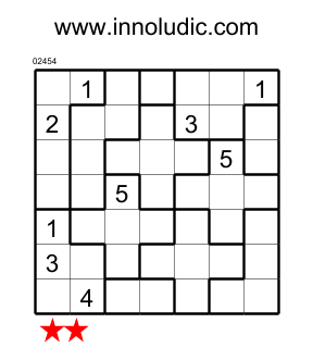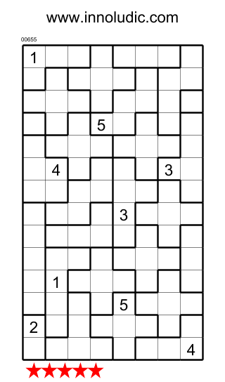 Suguru is a grid composed of regions of different shapes and sizes (from one square to five squares). The numbers 1 to 5 must be placed in each square so that no two adjacent squares have the same number and each region contains the numbers according to its size. Thus, a region of one square will have the number 1, a region of two squares will have the numbers 1 and 2, and so on up to a region of 5 squares which will have the numbers 1, 2, 3, 4, and 5.