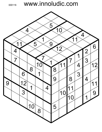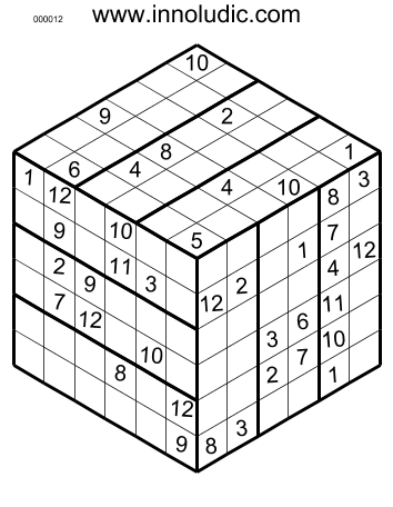 There is a 6x6x6 3D Sudoku puzzles (Rules of Sudoku 3D). Each row, column and region has 12 cells so you must put the number from 1 to 12 in each row, column and region. Note that columns and rows spread on two faces on the cube.