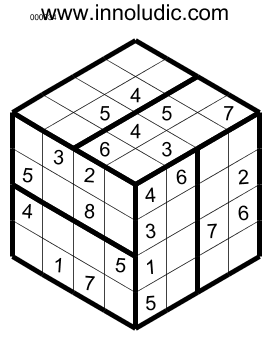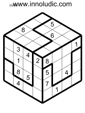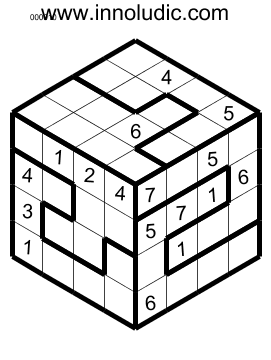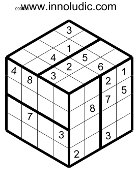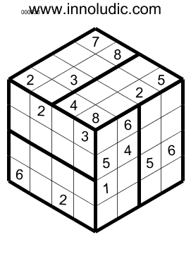 I present you Sudoku 3D puzzles. As you know the Sudoku 3D is a Sudoku on a cube. Lines on a face (horizontal as well as vertical) continu with the lines on another face to form row and column. Then a row or a colomn spread on two adjacent faces of the cube. So in each row and column you must put numbers from 1 to 8.