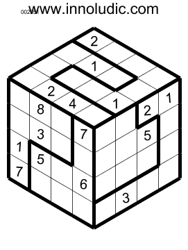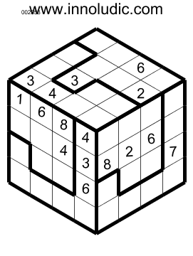 Here are some 3D Sudoku puzzless. Instead of the conventional 9x9 square grid used for classic Sudoku, this is a cube-shaped grid with three visible sides measuring 4x4. Numbers from 1 to 8 must be used. What's more, the regions (which must contain numbers from 1 to 8) are irregularly shaped, which adds to the challenge. The last puzzles is made up of two cubes, so the rows/columns, as well as traversing two faces of the same cube, can also traverse two (contingent) faces of two different cubes. The best way to appreciate this game is to try it out.