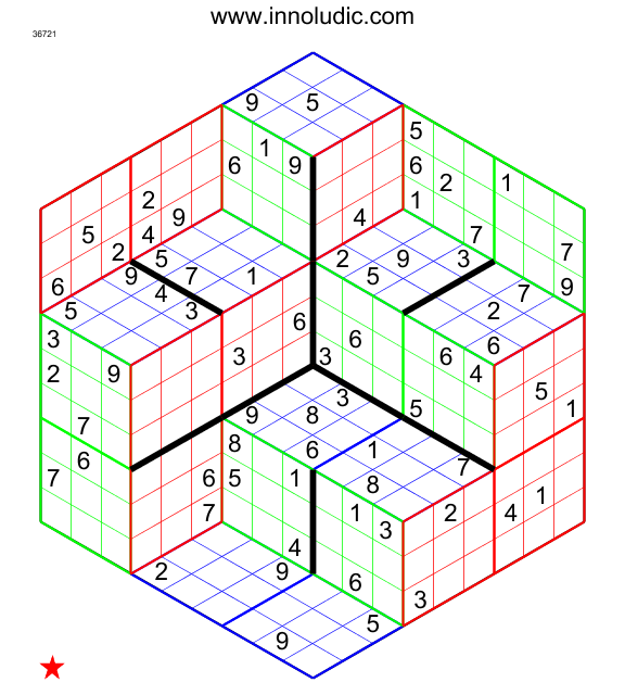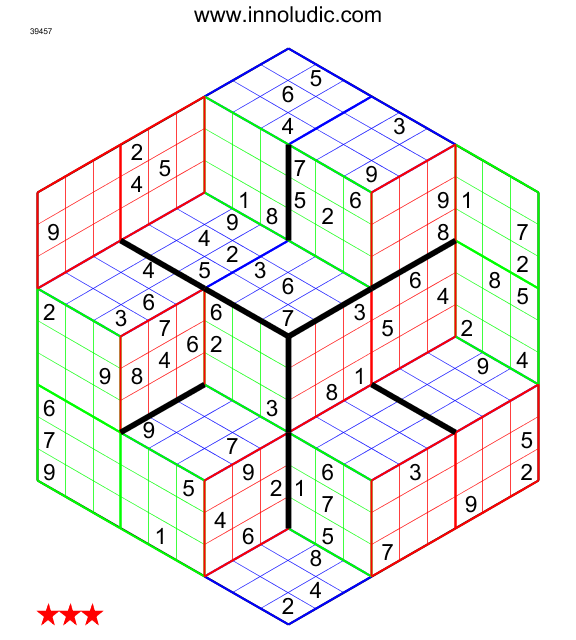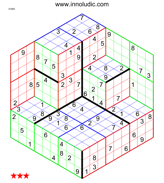 Here is a three-dimensional Sudoku puzzle, which is actually three classic Sudoku puzzles placed on different cubes. To find out where a row or column begins and ends, simply start at one side of the grid and follow the direction of the squares until you reach the dark line that marks the boundary of the row or column. These rows and columns can follow a winding path, which is what makes the game so confusing. Each square (3x3) represents a region.