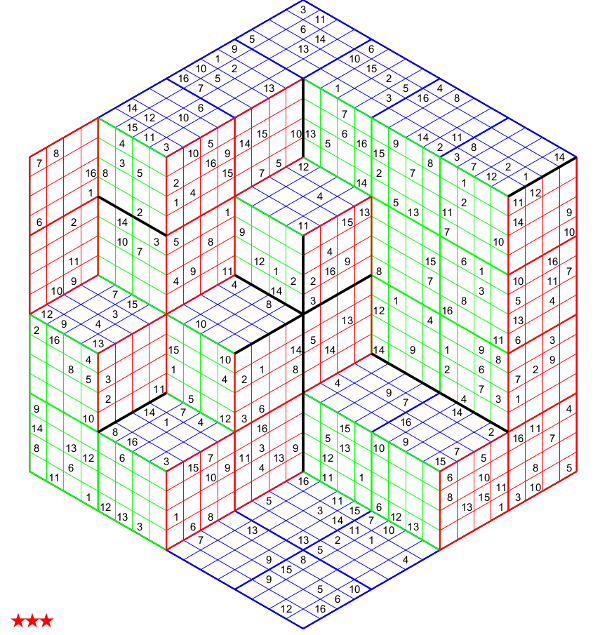 The Super Sudoku (16X16) Three Dimensions (Rules of Sudoku 3 Dimensions) could been seen only on this website. This puzzle could take a lot of different shape, in fact I have estimated that I am able to create 232 847 different configurations. It looks daunting with its impresive combination of three Super Sudokus (of size 16X16) shaped as a three dimensional Sudoku. But this not a reason to not take the challenge, in fact this puzzle will keep you busy for long time. But at the end you will feel pride of having tamed the beast. You need to enter the number from 1 to 16 into each region (box of 16x16) and each row and column. The row and column are dertermined by the 4 first regions in line with an edge. So if you start on one edge (anyone) you have 8 regions before reaching the other edge of the puzzle. The bold lines indicate the separation beetween two columns or rows.
