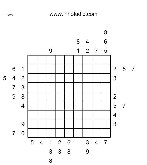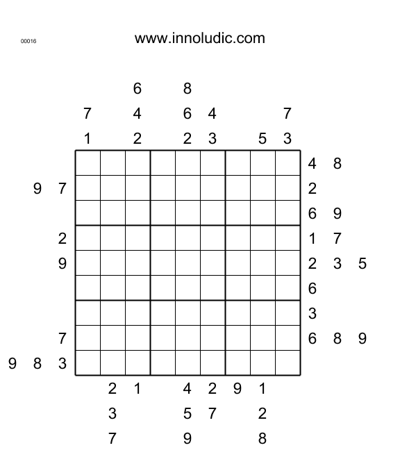 This week the Outside Sudoku puzzle has the spot light (Rules of Sudoku Outside). The puzzle has no given inside the grid, the clues are around the grids. The numbers in front of a row or a column indicate that they are in one of the first three cells of this column or row. With that and enough refelxion you are able to compltete the Sudoku.