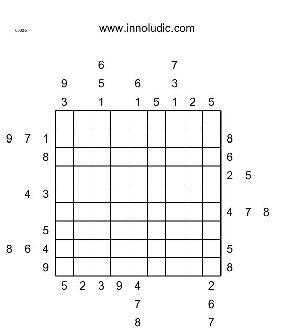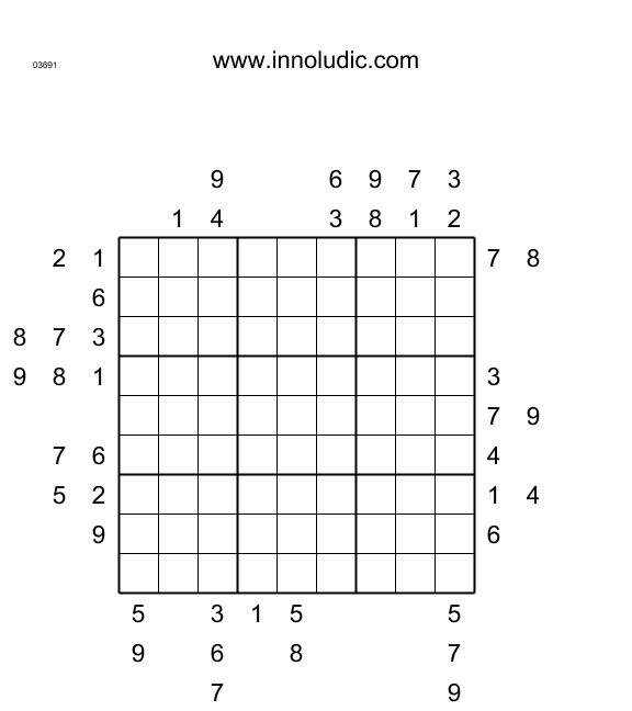 There are two Outside Sudoku puzzles this week. This puzzle is Sudoku, but the grid contains no clue; instead the numbers around the grid are in one of the first three cells of the row or column. It is sufficient enough to resolve the puzzle. At first, progress is not very impressive. However, we are eventually able to eliminate options and to figure out the contents of some cells based on the clues outside and the rules of Sudoku. Finally, when the grid is solved, we feel a lot of satisfaction.