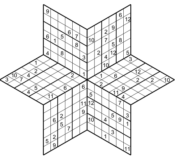 It is a long time since I provided you a Super Spark Sudoku puzzle (Rules of Spark Sudoku). So this is one is a hexagram (a star with six branchs) dont forget to use number 1 to 12.