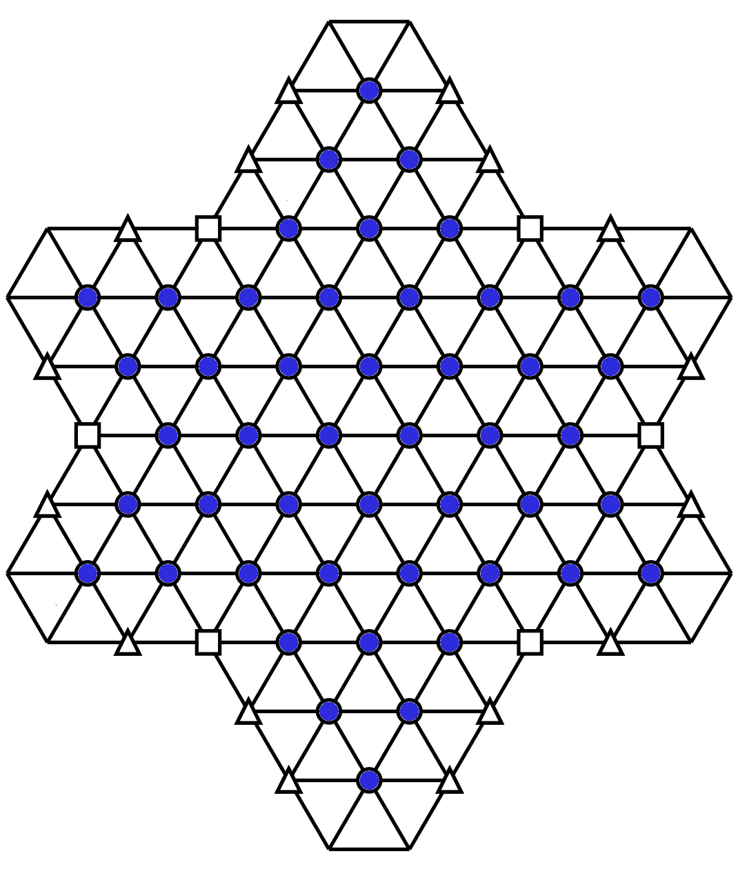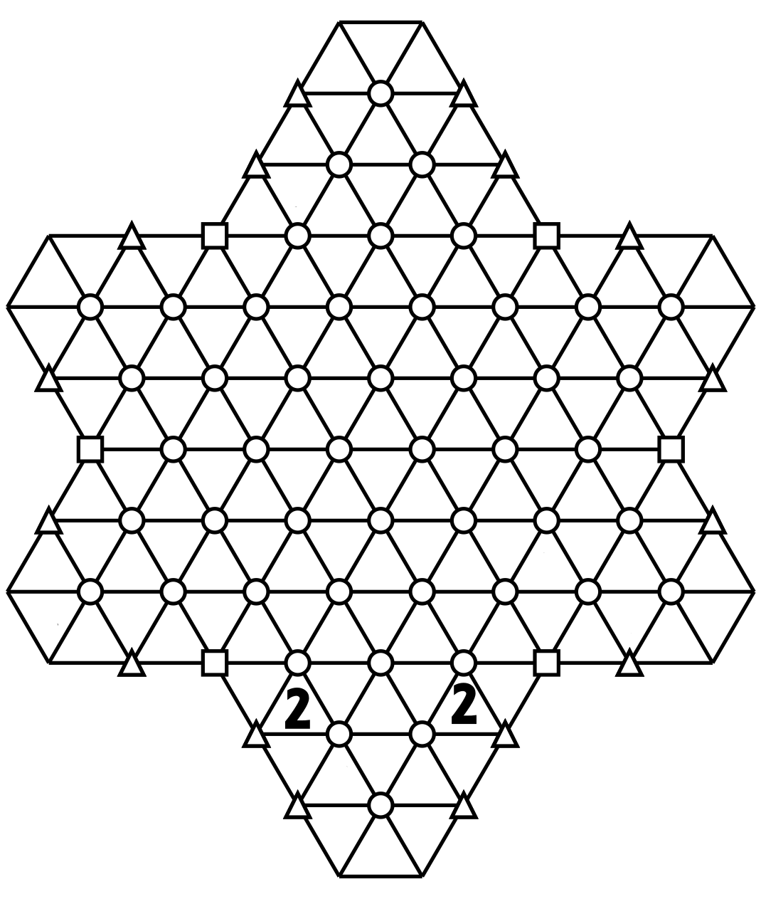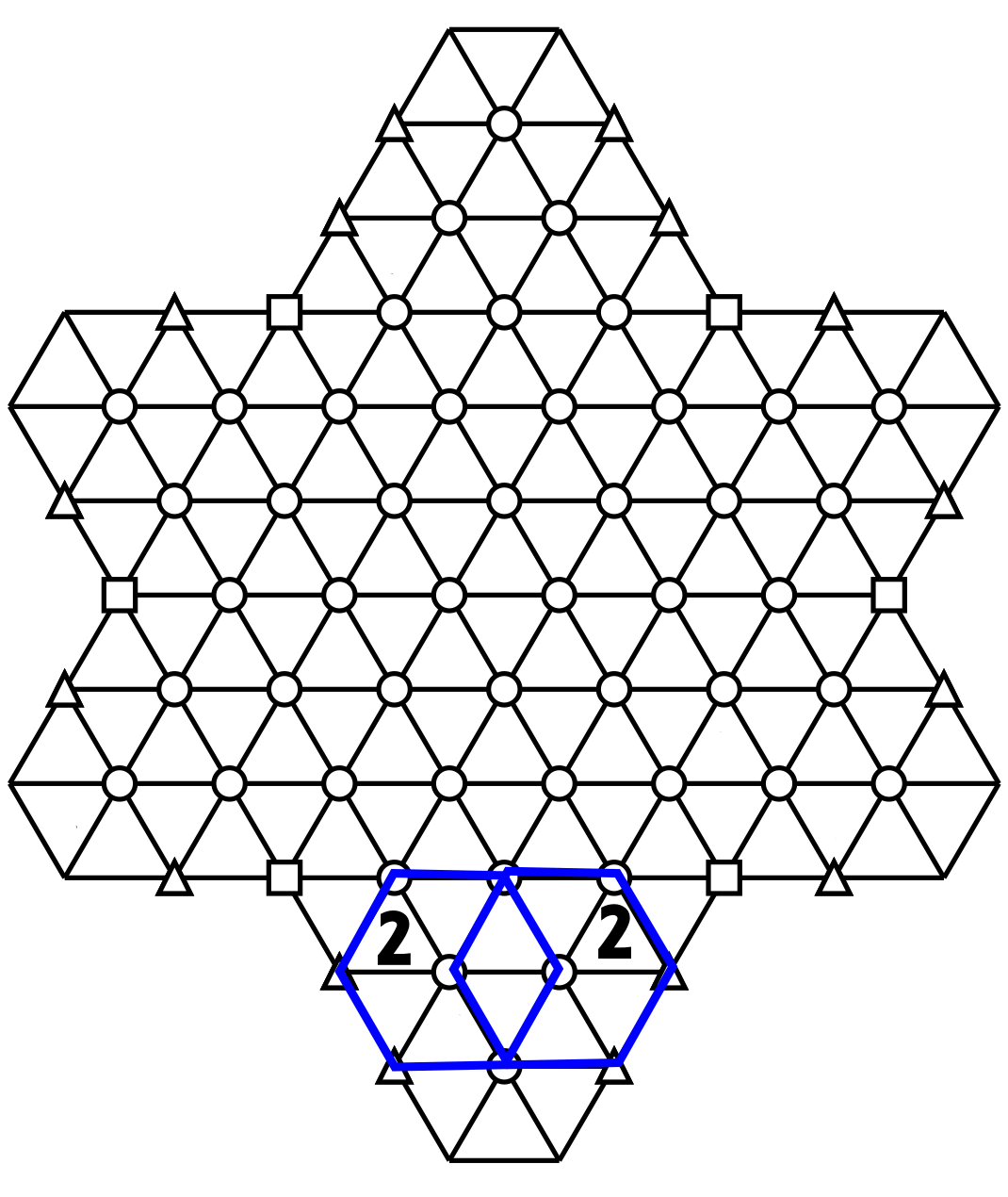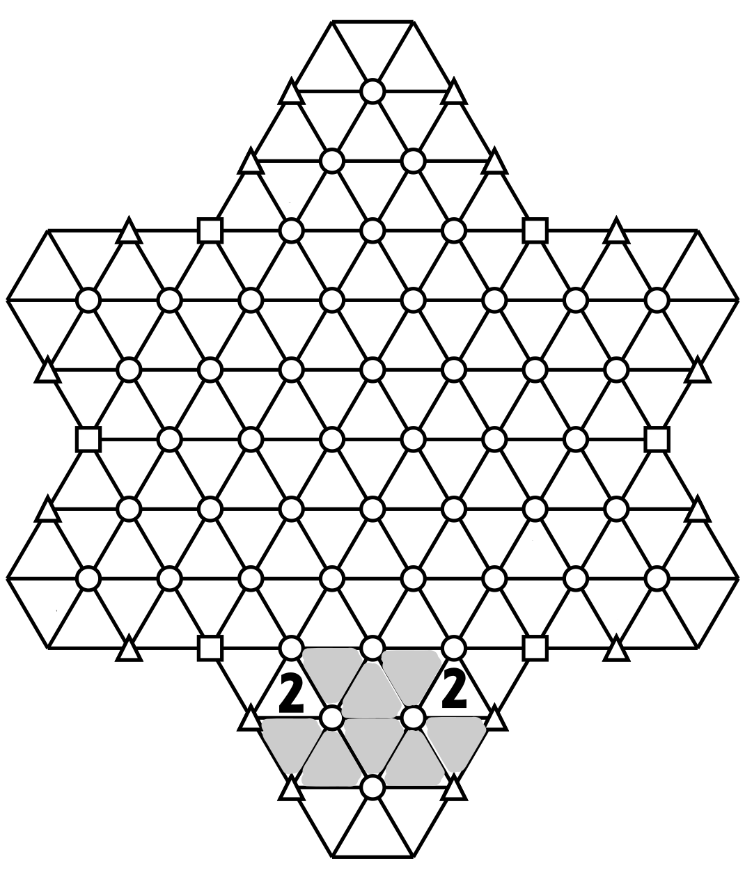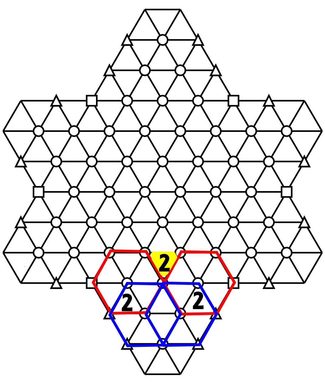 And last but not least: there are 3-triangle partial hexagons with a small triangle at their center (green). Enter 3 different numbers from 1 to 6 around the small triangles.