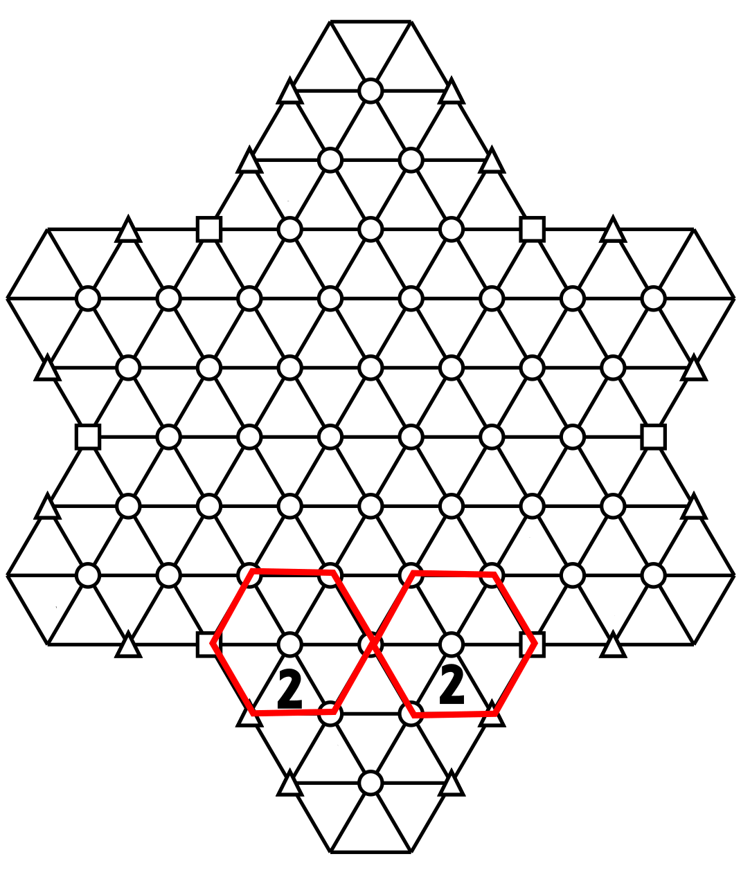 This means that all the triangles in grey) in these first two hexagons will not have a number 2.