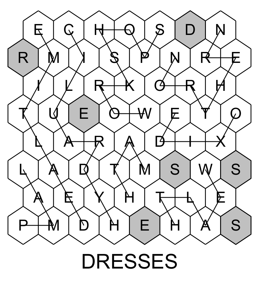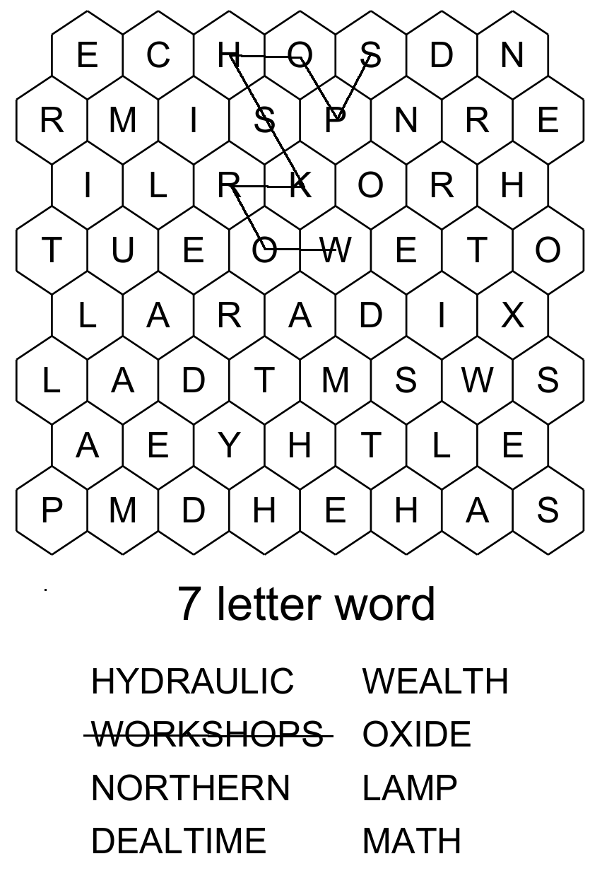 This puzzle is one of my creations, This is a hidden words puzzles on steroid ! The rules are the same : find and mark all the words (from a list) inside a grid. At the end the remaining letters form the hidden word. The diffirence is that the grid is composed of hexagonal cells and the letters of a word can be arranged in a straight line, but also (most often) in sinuous lines that go in all directions. See for example the word "Workshops" which appears in the grid.